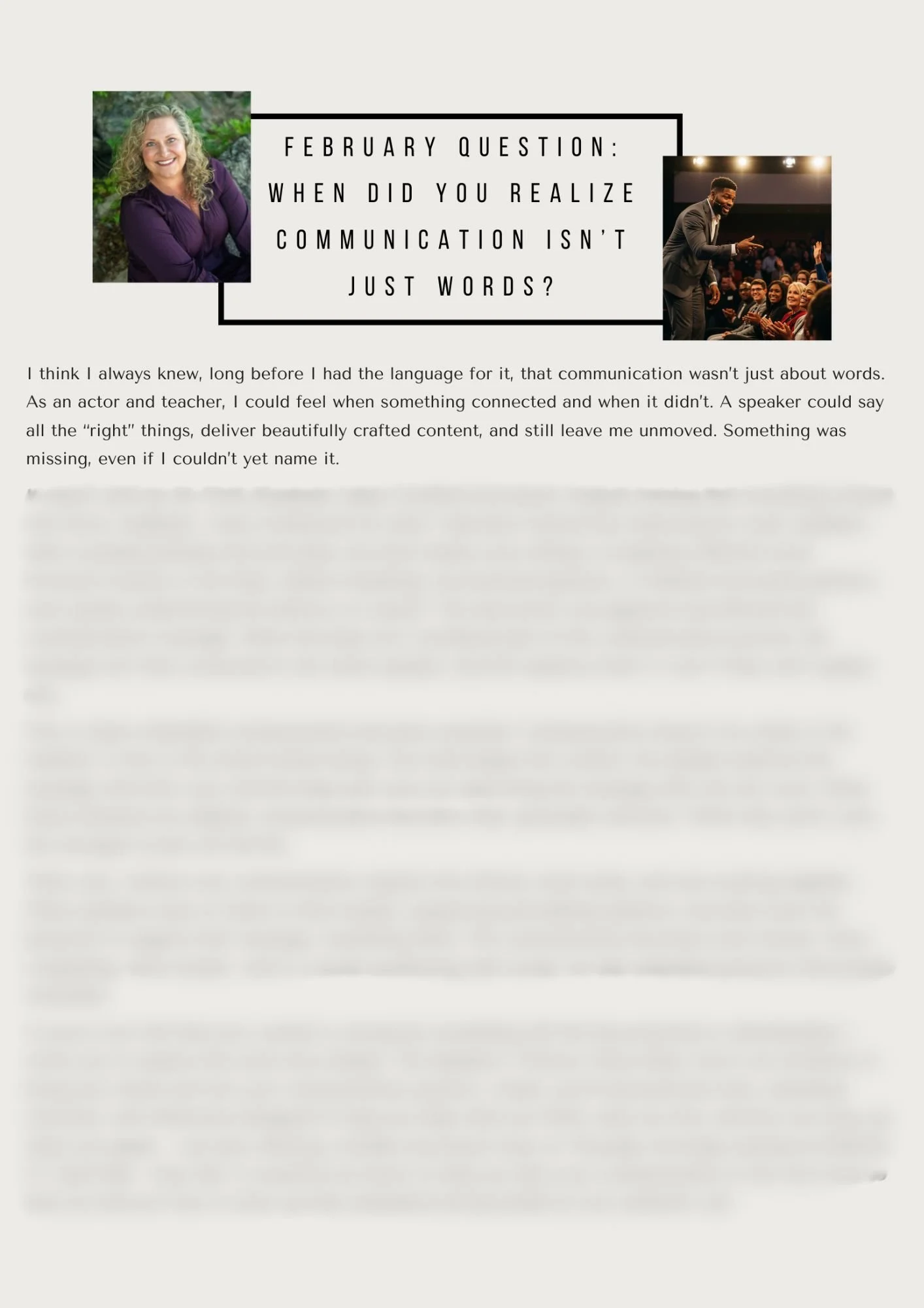 Welcome to my February Newsletter: When Did You Realize Communication Isn’t Just Words? Does that peak your interest? Enter your name and email address below to find out how to bring your mind, body, and soul to the stage. This will add you to my monthly newsletter which will include my musings on best communication practices, answer frequently asked questions from my clients, and upcoming events for Kristi Coaches Communicators.